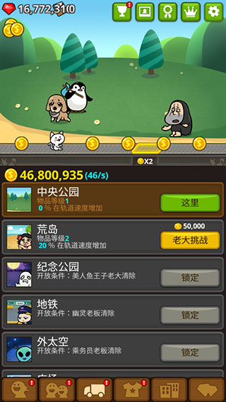 1、玩法针对于游戏的玩法来将,前期比较的繁琐,需要手动点击铁路带上的金币来获得收益,但随着游戏的进行,角色的招募,会让你获得金币的方式更加的轻松,期间提升角色等级可带来更多的收益,挑战BOSS成功,更换地盘还能让铁路带更加的快捷