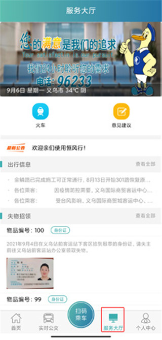 3、服务大厅页面:可以在这里看到出行信息和失物招领;