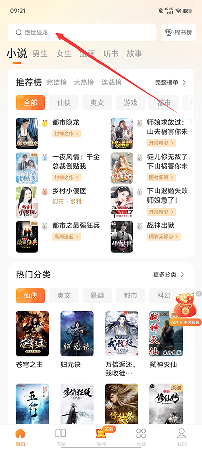 2、在搜索栏内输入想要看的小说;