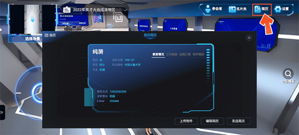 6、点击“简历”,求职者可以编辑个人信息、上传附件及发送简历;企业招聘人员可以接收求职者简历并将简历和附件发送到邮箱,同时可以与求职者进行联系。