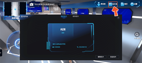 5、点击“名片夹”可以编辑并发送个人名片,查看、导出收到的名片,同时可以与名片持有者进行联系。
