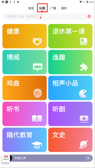 1、在本站下载云听乐龄版app并打开;2、进入首页点击分类,可看到有着多个板块资源供你选择;