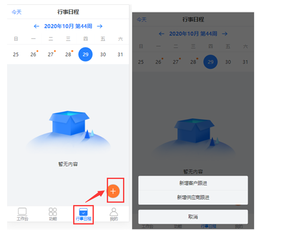 点击下方导航栏的【行事日程】按钮,在行事日程界面选择完日期后,点击【+】按钮,选择【客户跟进】或【供应商跟进】,然后就可以创建跟进/日程了。