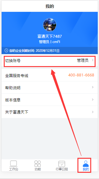 点击下方导航栏的【我的】按钮,然后点击【切换账号】就可以切换到子账号。
