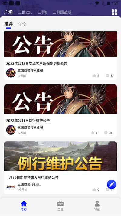 4、集合了“三国群英传”系列IP游戏独家资讯和丰厚游戏福利,为三国群英传爱好者提供实用游戏工具助手,致力于打造一个“煮酒论英雄”的开放社区。