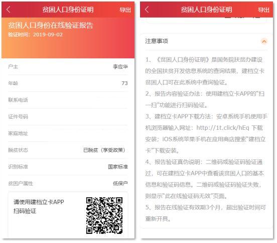 (3)点击页面右上角的“导出”,可以导出图片,图片可打印。说明:需要贫困证明的单位或学校使用建档立卡APP扫描验证报告中的二维码,可验证贫困人口身份。