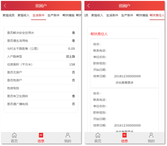 底部菜单栏中的“信息”,可以查看本户信息,包括户基础信息、家庭成员、家庭收入、生产条件、生活条件、帮扶责任人等信息。