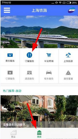 1、用户打开上海铁路12306app后,进入“商旅”页面,然后点击“订餐服务”