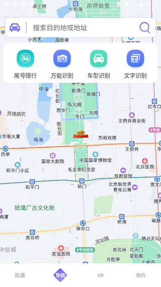 2、进入导航功能模块,用户可以进行导航出现也可以使用所示四项功能:尾号限行、万能识别、车型识别、文字识别