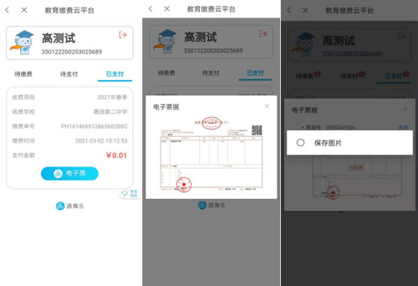 完成缴费后,点开“已支付”页面,点击“电子票据”,即可生成电子票据,并可直接将票据图片保存到手机上。