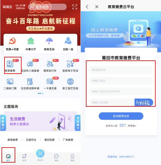缴费查询打开莆田惠民宝APP,首页选择“教育缴费”,进入缴费云平台页面,输入需缴费学生的详细信息点击查询缴费信息。(全市已有521家学校,也欢迎其余学校入驻)