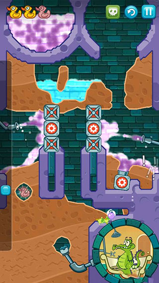 游戏还有不少特色:新增了“挑战模式”,里面有些关卡会让水往上流,鸭子会变形态,挺有意思的;道具方面也做了优化,有真空、滴管这些工具,还能解锁提示功能。场景设计也很棒,新增了下水道、肥皂工厂和海滩三个地方,每个地方都有独特的风格和故事。