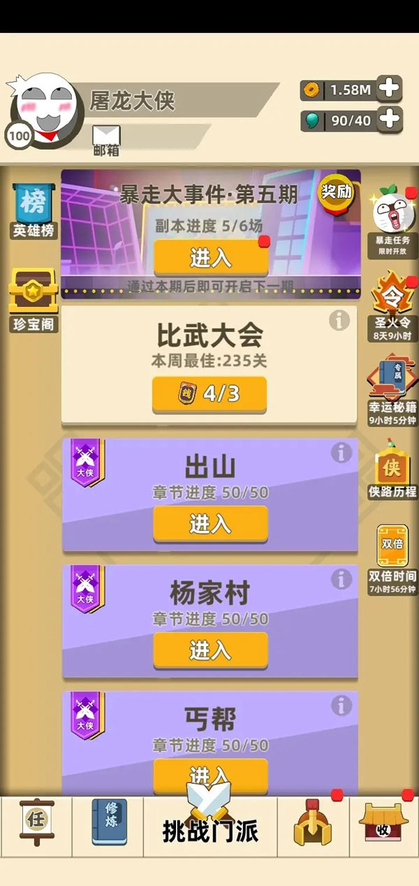 ②打过了大侠关卡后建议挂大侠关卡,不一定要通关,打过第一关就行,剩下的交给跳关。