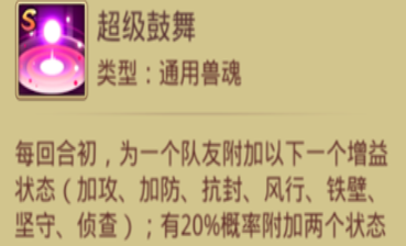 宠物方面我们只需要上阵一个主宠,准备个1级的垃圾宠就行,打个“超级鼓舞”技能,没有的话高级也勉强能用。鼓舞技能即使宠物死了也会继续生效的,每回合都能给我们随机上一个加攻、加防、铁壁等buff。