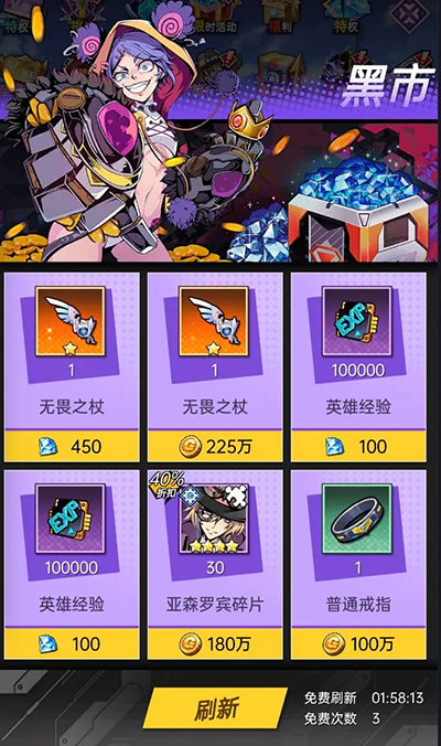 前期英雄晋升以及战力到达瓶颈期的时候,进入黑市购买英雄经验以及装备是个不二选择,黑市的物品资源只需要金币以及钻石便可购买,只要能攒住钻石以及金币你不需要氪金也可以打造出一套战力不俗的阵容;