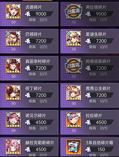 英雄碎片商店:很多人会出现英雄达到上限这种情况,这种情况就是你去招募英雄的时候,获取了太多的三星英雄了,这时候去人事管理处遣散英雄的时候,它会返还英雄碎片,这个英雄碎片可以到英雄碎片商店进行兑换核心英雄碎片,这是个很值得操作的商店,强力推荐暂无主C英雄或者T0梯队英雄的萌新玩家;