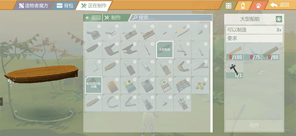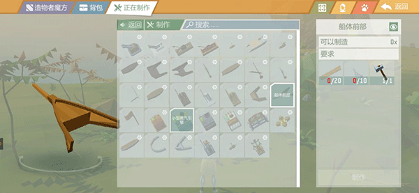 船体主要组件有:船舶、船舵、船锚、带帆桅杆、船体前部、船体后部,总计6种不同的组件。需要的材料和工具主要有:原木、钉子、布、任意绳子、任意锤子、裁缝工具箱、木板、任意斧头、任意锯子等。而这些东西,正是需要岛主们通过之前建造出的工作台来制作。