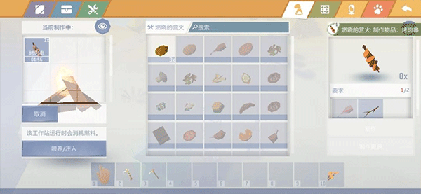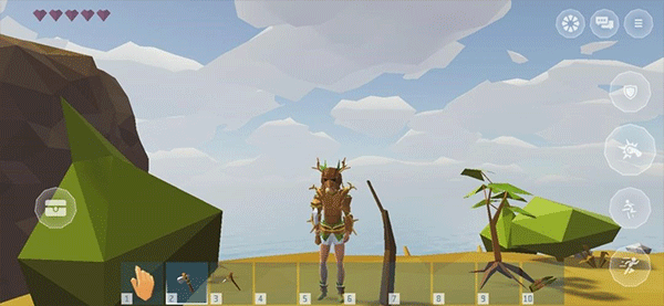 在出生岛上树木繁多,其中有很多果树,岛主们可以采摘果子进行充饥(靠近果树→采摘果实→打开背包→食用果实),但果实能减少的饥饿感比较有限,所以此时岛主们可以拿起制好的石斧,去捕猎一些兔子、野猪、螃蟹等生物来获取他们的肉类,然后回到营地将其放在篝火上即可制成美味的烤肉~