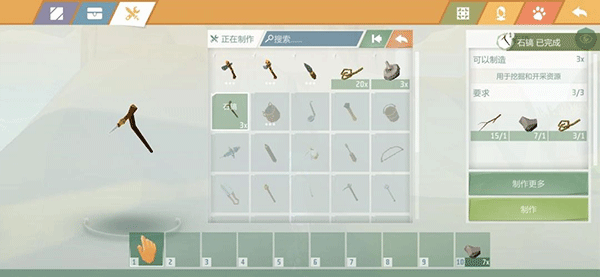 在探索模式中,在出生岛开始游戏后,大家都是一无所有的状态,因此为了能够在岛屿上更好的生存,我们首先需要跟随新手引导做出一把石斧,无论是砍树,还是狩猎都是非常实用的工具。岛主们只需要在地面上拾取【石头】、【木棍】、【燧石】、【草】等最基础的材料,即可制造出赖以生存的第一件工具——石斧。有了石斧,就可以开始快速高效的砍伐树木,获得原木。这样不仅可以制作出一身树皮盔甲,还可以搭建一个休息的营地,及搭建出篝火。