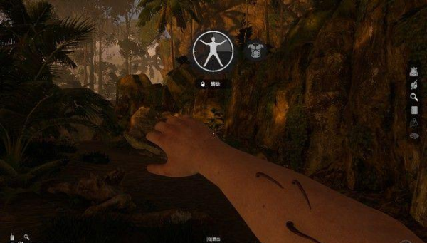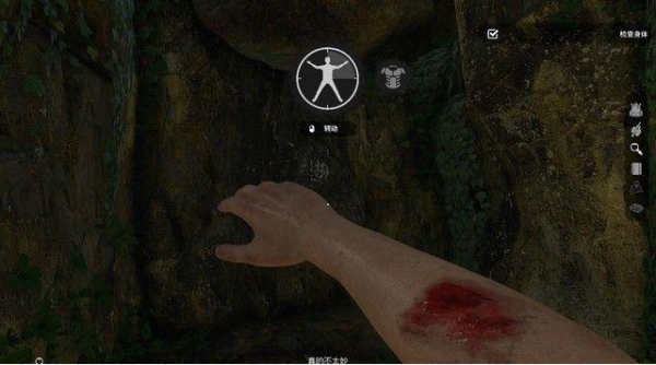 查看身体,选择右臂,然后旋转,可以发现,手臂受伤了。这就是疗伤的第一步,之后如果在游戏中被咬伤,或者被虫子寄生,都要先查看。包扎伤口需要绷带,进入笔记界面可以查看船子草的外形,这是一种长着黄花的植物。