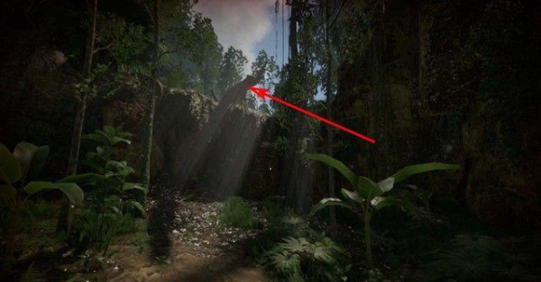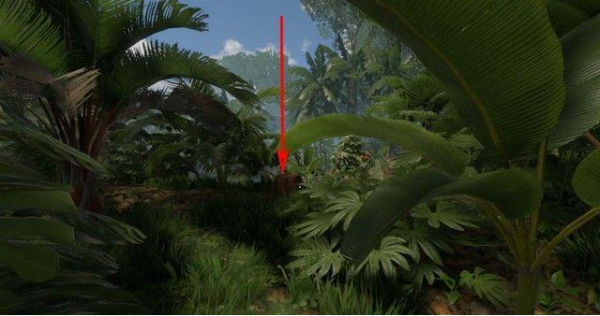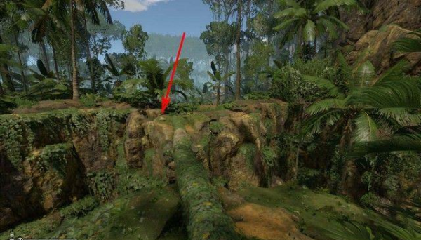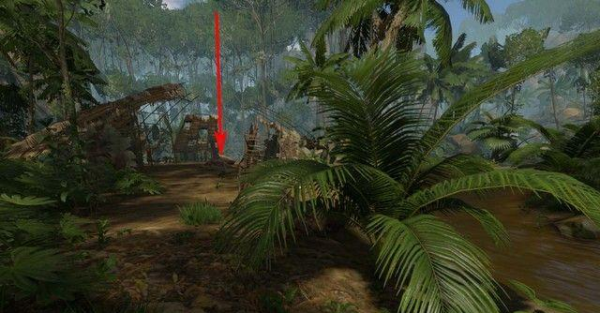 过河之后再继续往前走就可以找到一个废弃的原始部落。这里可以当做是一个基地。如下图箭头所指,在废弃的火坑里面可以找到烧毁的背包,里面有地图,接下调查地点的任务。