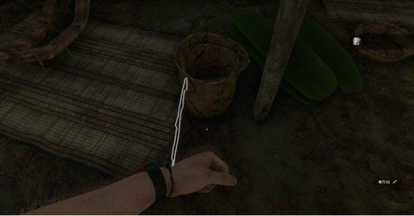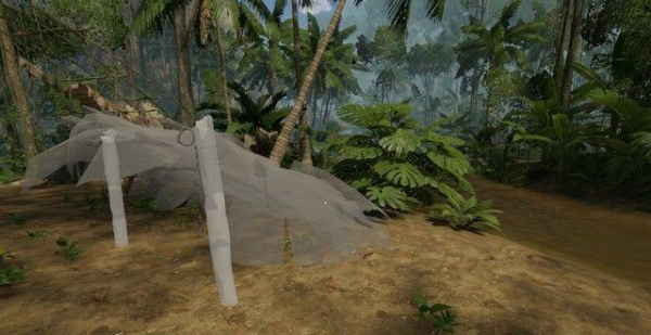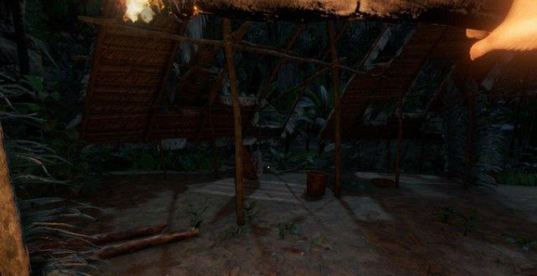 可是,由于工作量较大,我们的石刀很快就坏了。去部落废墟的吊床那里,如下图,在桶旁边有骨刀,这是一种耐久度远比石刀优秀的武器。接下来就去砍树吧。