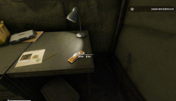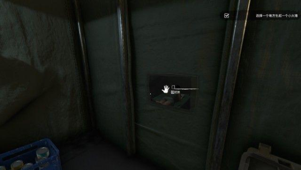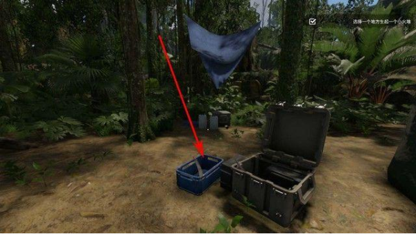 出帐篷,首先我们需要一把刀才能继续,如下图箭头所指,门口的箱子里面就有刀。