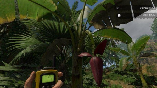 如下图,你可以在四周找到香蕉树(上面有红色果实的就是),采集上面的香蕉,这是最简单实惠的食物,可以用于充饥。