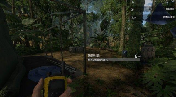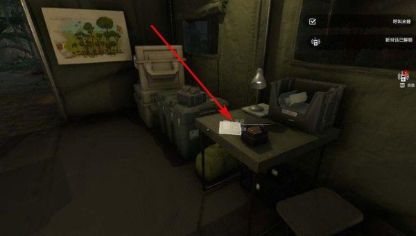 第二天醒来的时候,发现老婆不见了,使用步话机联系老婆,她居然一个人独自去找野人部落了。如下图箭头所指,在帐篷里的桌子上有字条,读字条继续剧情。老婆告诉你,桌上有送给你的礼物,这是一个多功能手表,可以定位,也可以查看角色状态。