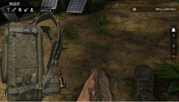 可是,老婆忘记带打火机,我们只能钻木取火。首先需要收集木板,拿着砍刀对着圆木挥砍,将其变成2个长木棍和一个木板,这样木板就有了,随后进入制作界面,使用,木板和小木棍制作一个生火器。