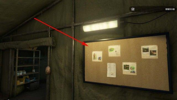 接下来需要去查看帐篷里面的黄颜色的布告板,度上面关于植物的笔记,之后提示你,要找的植物在帐篷的北方。