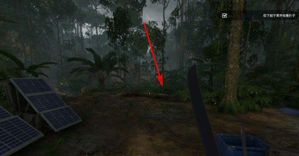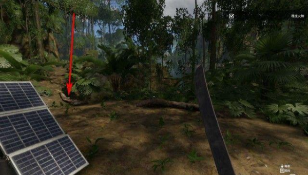 如果要钻木取火,还需要干燥的材料才行,这些材料可以是枯草,也可以是鸟巢。如下图箭头所指,到帐篷外边的太阳能电池板这里,以电池板为参照物,可以发现,不远处就有一个鸟巢。