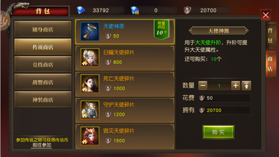 ① 您在传说之塔获得的传说币可以在传说商店之中购买道具和大天使碎片,用于大天使养成。