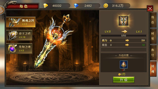 在点击主界面“角色”,选择“铸魂”页签进入强化界面。