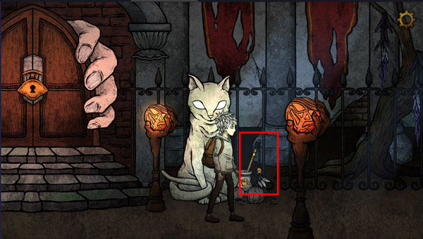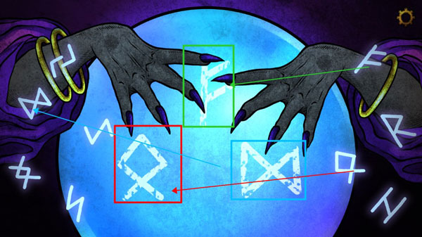 2、醒来后出现在柜子里,一直往右走,出现紫衣女人,对话后将对应符号挪到魔法球上,进入以下情景,红框处拿起金针