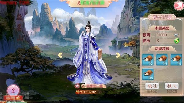 45级开启无名山的初级试炼,试炼一共15层,每一层都会挑战一名实力相当的随机玩家,但难度会逐渐增加,每通关一层会有宝箱的奖励,宝箱内会有银两和“影玉”等丰厚的奖励,每位小主每天会有1次免费重置的机会。