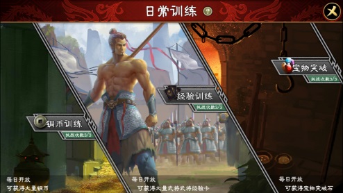 在《三国志大战》中每天完成日常训练就能积累很多的资源“如:巨额铜币、武将经验卡、宝物突破丹”,千万不要觉得这些资源不重要,武将升级是需要花费铜币和经验卡的,主公等级越高,武将所需的经验越多,前期每天完成日常训练积累资源,对各位主公是有大大的帮助!