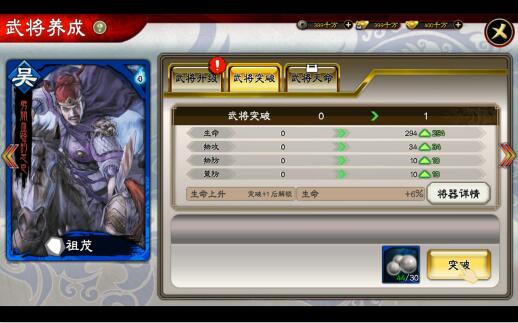 完成副本第一章,就可以开启武将突破,武将突破需要消耗“突破丹”,突破之后会大幅度的提升基础属性,更会解锁额外加成。