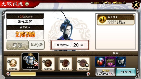 无双试炼在小伙伴前期根据主线任务提升等级后即可解锁,这里每个军团都有主公所需的神装兑换材料,以及装备洗练石等诸多实用道具,同时每击败一个军团最主要获取的是“镔铁(神装兑换材料)”
