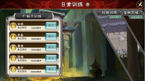 训练分为三个 “铜币训练、经验训练、宝物突破”,三个训练分别能获取的奖励想必各位主公看名字就知道了,小乔就不多介绍了~