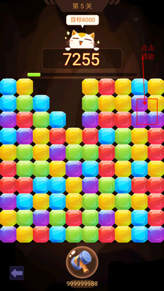 1、只需点击两个或两个以上颜色相同的宝石即可消除;