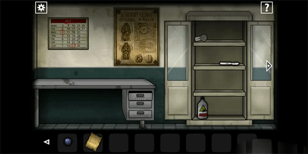 在第四个房间(医务室)醒来后,观察墙上的日历,发现标注为OCT的日期,推算得到密码为「10421」。接着输入密码打开下面的抽屉,获得一串钥匙。