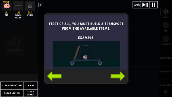 新手可以按照指南进入“战役”模式完成各种任务,熟悉游戏机制;如果想尽情发挥创意,可以选择“沙盒”模式,在广阔的世界里随意搭建。游戏中有超过100种道具和工具,比如搬家工具、旋转销、固定销等,帮助你实现更多复杂的设计。