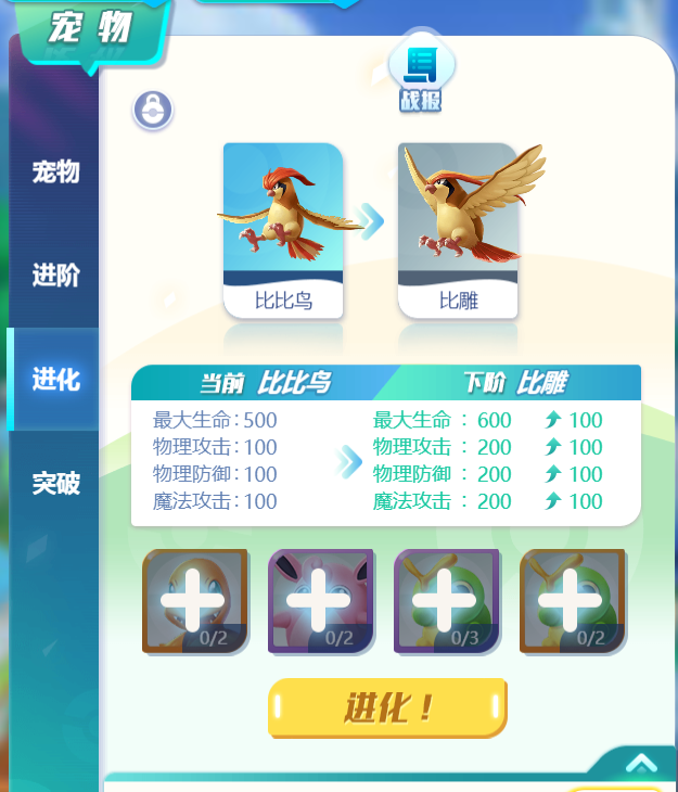 1、升级:通过消耗道具,可以对选中的宠物进行升级