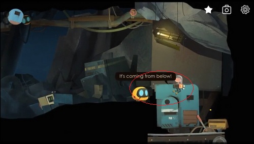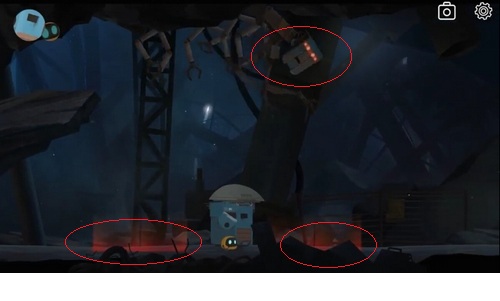 5、走到这里了,你会看到有东西在往下扔,这时候你会发现上面有个机器人,现在开始捡那个东西,然后向右,不要碰到红色区域。