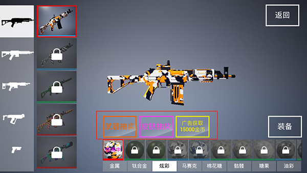 4、可以通过武器抽奖、皮肤抽奖和广告获取得到更多的武器;