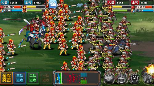 游戏中的基础战斗是军队冲锋攻击的模式,我们可以将自己的军队排列成三队,然后可以控制阵型和冲锋时机,通过合理的士兵兵种搭配和冲锋阵型,来最大程度的快速消灭敌人。