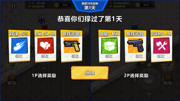 双人末日求生是一款末日生存类型的射击游戏,现代城市文明被摧毁,秩序被破坏,一切资源都需要你去发掘创造,但是面对源源不断的僵尸大军,玩家需要努力消灭他们并活下去。这也是一款双人同屏游戏,游戏的玩法简单,只需要利用物资在城市上生存下去,就并不难,但是我们发现这座城市到晚上会变得异常恐怖,各种变异的动物和僵尸,在晚上都会来袭击我们,玩家通过建造庇护所,武器,来获得救援,虽然晚上会有很多僵尸袭击玩家,但是只要有装备,都是小意思,而且每一天都会有三个卡牌选择,玩家三选一,不,应该是二选一,三选二,所以很奈斯,而且开局人物选择,还有一些人物是有特殊技能的。末日生存这类游戏玩法,一直以来深受玩家喜爱,现在的社会和平稳定,大部分人没有体会到物资匮乏,而带来的生存绝望,在游戏声讯模式长夜漫漫之中,玩家可以体会到生存的刺激紧张感,快来合理配备你的武器,建设一个属于你自己的伊甸园吧!