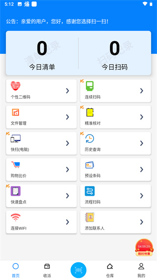 2、首页页面,可以查看今日清单、今日扫码数量,还包含个性二维码、联系扫码、文件管理、精准核对、购物比价、预设条码、快速盘点、流程扫码等功能。