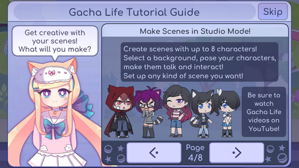 4、在工作室模式中制作场景!创建最多8个角色的场景!选择一个背景,选择你的人物动作,让他们交谈和互动!设置任何你想要的场景!务必观看扭蛋人生的视频!